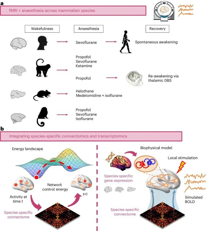 研究团队利用功能性磁共振成像(fMRI)比较了人类、猕猴、狨猴和小鼠在清醒与麻醉状态下的大脑活动。他们发现,清醒的大脑如同一个高度协作的交响乐团,各脑区信息高度整合;而麻醉后,这种协同作用消失,大脑活动变得支离破碎。关键性的突破在于,当研究人员对麻醉中的猕猴进行中央丘脑深部脑刺激时,大脑的“交响乐”被重新奏响,信息整合得以恢复,动物也随之苏醒。为了探究其深层机制,团队结合了脑连接图谱和基因表达数据,构建了计算模型。分析表明,信息整合的崩溃与PVALB基因(一种调控神经抑制的基因)的表达模式密切相关,而中央丘脑因其广泛的结构连接,使其成为恢复全脑信息整合的最优控制节点。这项研究揭示了哺乳动物大脑中控制意识的进化保守机制。研究发表在 Nature Human Behaviour 上。