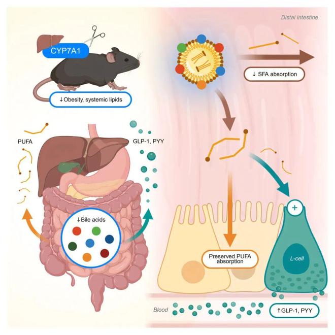 研究团队利用CRISPR技术抑制了小鼠体内合成胆汁酸的关键酶(CYP7A1),并将其与服用减肥药奥利司他(Orlistat)的小鼠进行对比。在高脂饮食下,尽管两组小鼠排出的脂肪都增加了,但只有基因编辑组避免了体重增加且未出现食欲反弹。研究发现,这是因为未被吸收的脂肪进入肠道深处,触发了饱腹感激素GLP-1(胰高血糖素样肽-1)的大量分泌。更重要的是,脂质分析显示胆汁酸并非通用的“洗涤剂”,它们对多不饱和脂肪(好脂肪)有优先亲和力,而饱和脂肪(坏脂肪)则需要更高浓度的胆汁酸才能被吸收。因此,降低胆汁酸水平可以特异性地阻断坏脂肪的吸收,同时保留对代谢有益的好脂肪。这一发现为开发针对肥胖和糖尿病的新型精准疗法提供了分子基础。研究发表在 Cell Metabolism 上。