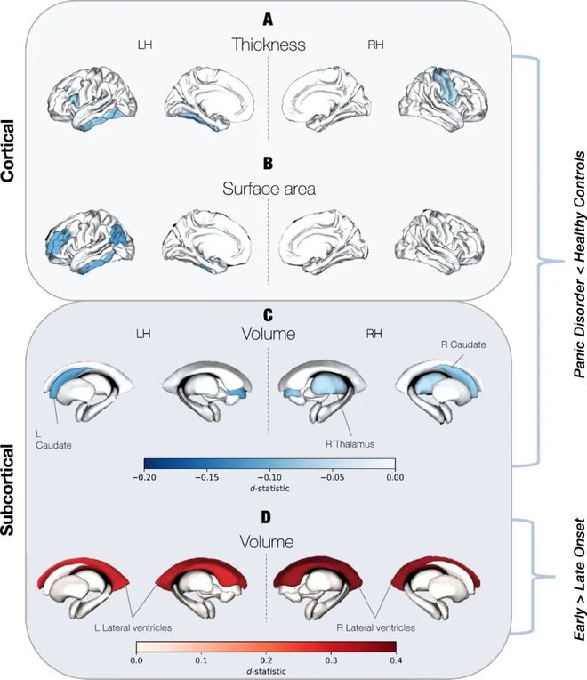 ▷与健康对照组相比,惊恐障碍患者的(A)皮质厚度较低;(B)皮质表面积较小;(C)皮质积较小。D 与晚发病(≥21 岁)的惊恐障碍患者相比,早发病(≤21 岁)的惊恐障碍患者的左侧和右侧侧脑室均较大。LH:左半球,RH:右半球。Credit: Molecular Psychiatry (2026).